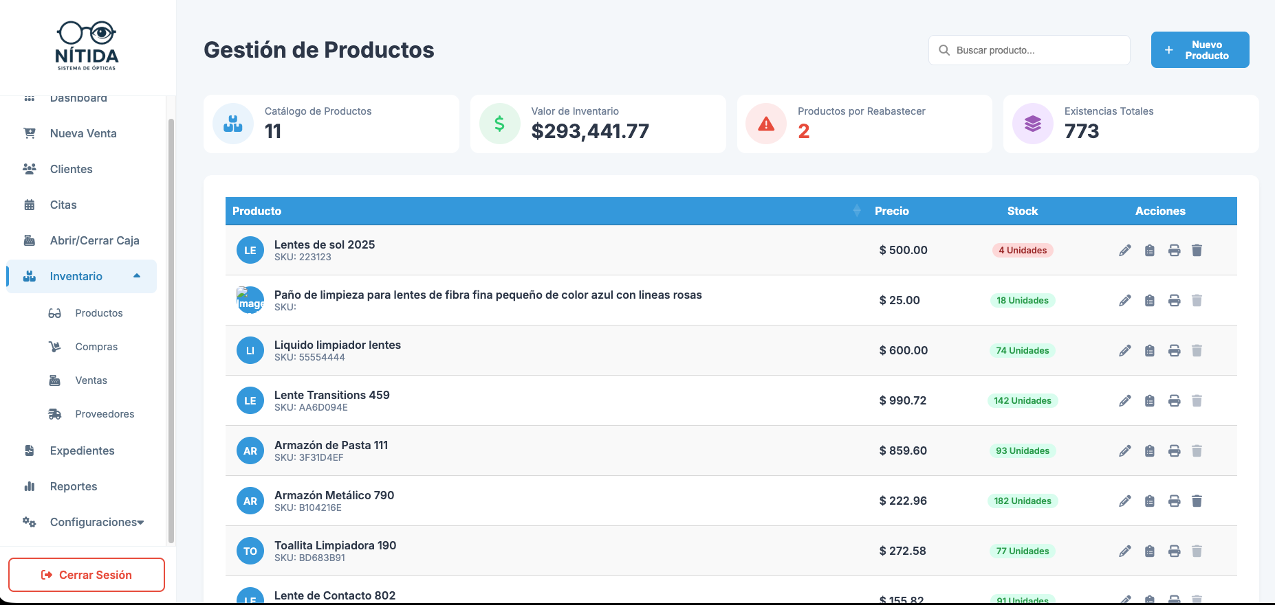 Clasifica por marca, material, modelo y graduación. Alertas automáticas de stock bajo.