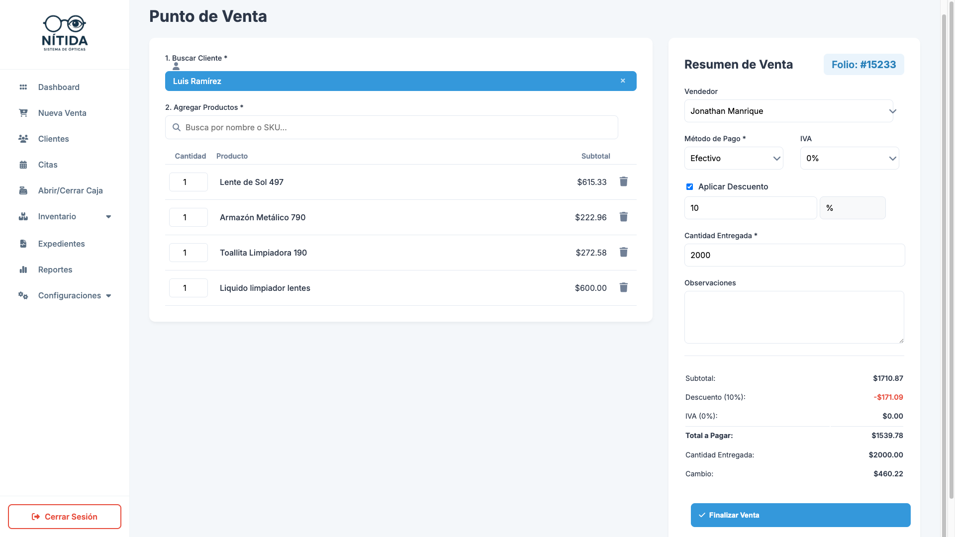 Deja de perder dinero en inventarios fantasma y citas empalmadas. AidaSys unifica ventas, pacientes, inventario y nómina en una interfaz diseñada para que tú solo te preocupes por la salud visual de tus pacientes.